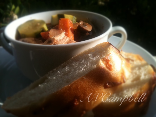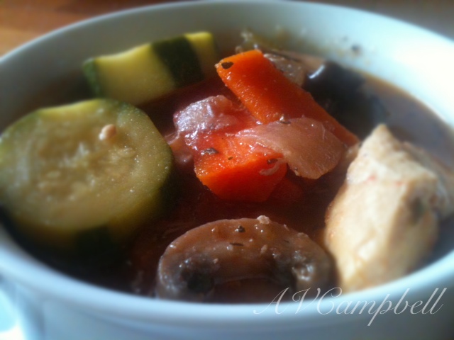 And with a little culinary-creativity and the following ingredients: chicken, Italian stewed tomatoes, Sierra Nevada Pale Ale, carrots, onion, garlic, celery, mushrooms, zucchini, chicken stock, Italian seasonings, fingerling heirloom potatoes and a dash of love, I whipped up an “Allison Campbell” original. No recipe necessary. No fear in the kitchen.  The excitement lies in diving into the unknown. Like anything in life, the best results are achieved using heart, soul and possessing a true passion for what you love!