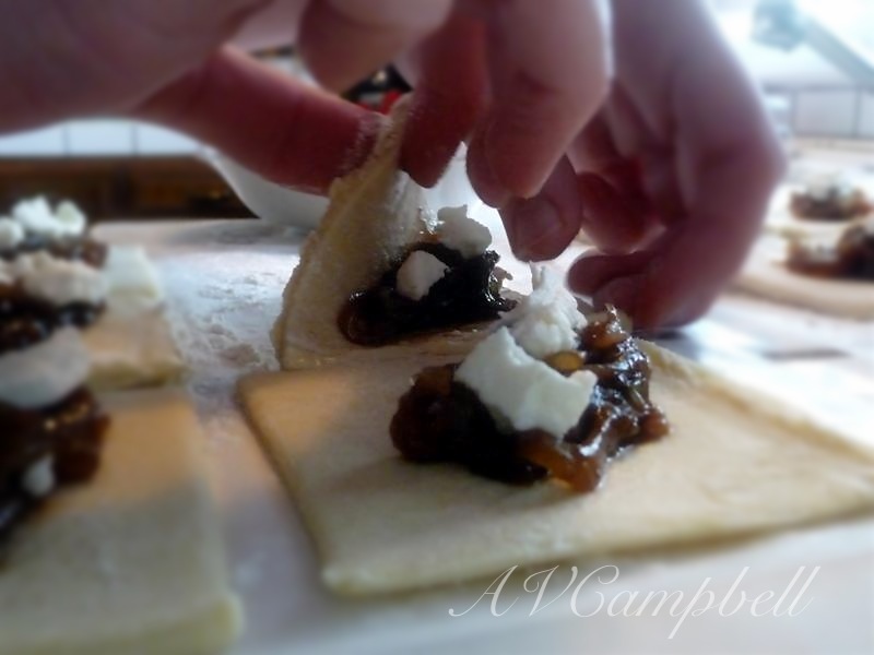 Dip finger in water and lightly wet two triangular (is that a word??) edges of puff pastry, to seal. Fold into triangle shape.