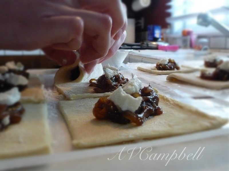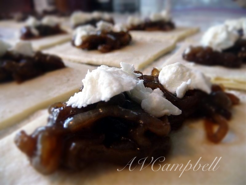 Creativity runs thick amongst the Campbell women. Especially in the kitchen. One afternoon my sister Laura found herself with left over Onion Marmalade that she had prepared and used as a sandwich topper a few days prior.  Also on hand was puff pastry and goat cheese.  At that moment, “Laura’s Puff Pastry Surprise!” was created! 🙂