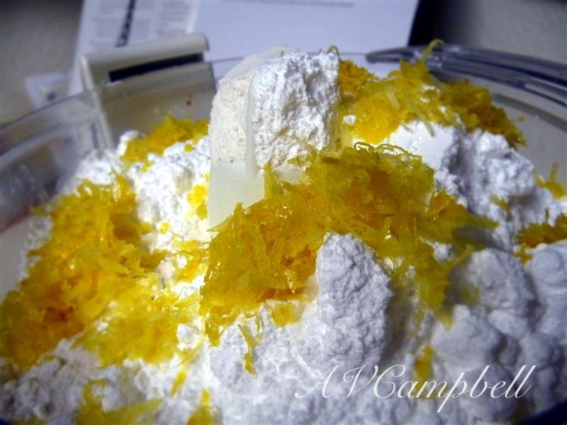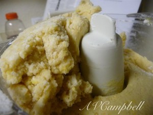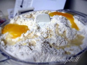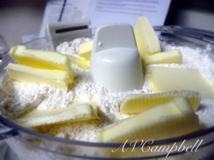 Add butter. NOTE: my food processor is small. 😦 I added one cube of butter, mixed in with the flour mixture, then added the second cube.