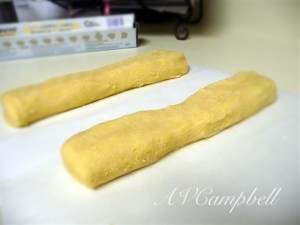 Divided dough in half and rolled into logs. This part was a bit of a challenge as the dough was sticky and the logs weren't very even.