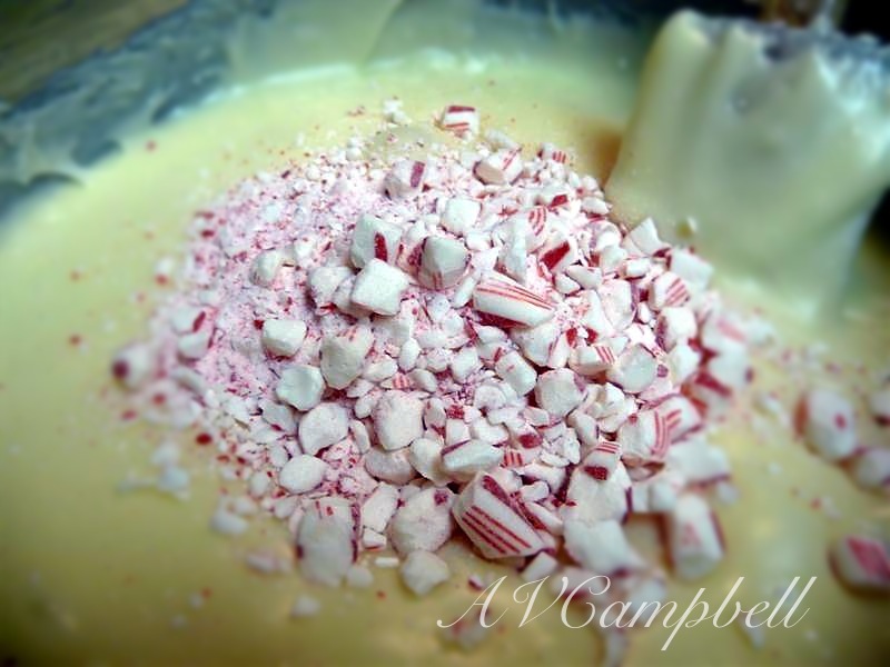 When chips are completely melted, stir in the peppermint extract, food coloring, and candy canes.