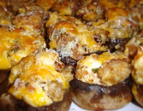 Mix cream cheese, cheddar cheese, green onions & bacon together. After browning and draining the sausage, add to cheese mixture. Put mixture in mushroom caps. Top with fresh, finely shredded parmesan cheese. Bake at 350 for 30 minutes.