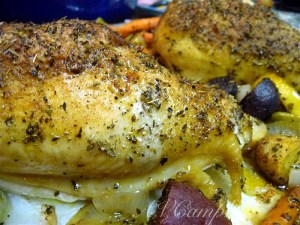 Once my chicken has been rinsed and patted dry, I place in a baking dish or on a parchment-paper-lined rimmed cookie sheet and scatter my selected veggies around the chicken. If preparing a whole bird, after pulling all the organs out (isn’t that a fun task!?), rinsing the inside and outside of the bird and patting dry, I salt the cavity generously and stuff with onion, cloves of garlic, lemon and fresh herbs (if using) before adding to my baking dish and veggies. Just thinking about the not-so-fun task of pulling semi-frozen organs out of a chicken makes me appreciate the simplicity of roasted chicken breasts! In photo #1, I used onion, celery, carrots and fingerling potatoes. I also cut up half a lemon, placing the slices under and around the chicken for added flavor. In photo #2, I used fresh rosemary, garlic, onion, bell pepper, carrots and lemon slices. In both cases, I drizzle all with olive oil and season to taste with: kosher salt, ground black pepper, garlic powder, oregano, basil, thyme, Hungarian paprika and poultry seasoning.