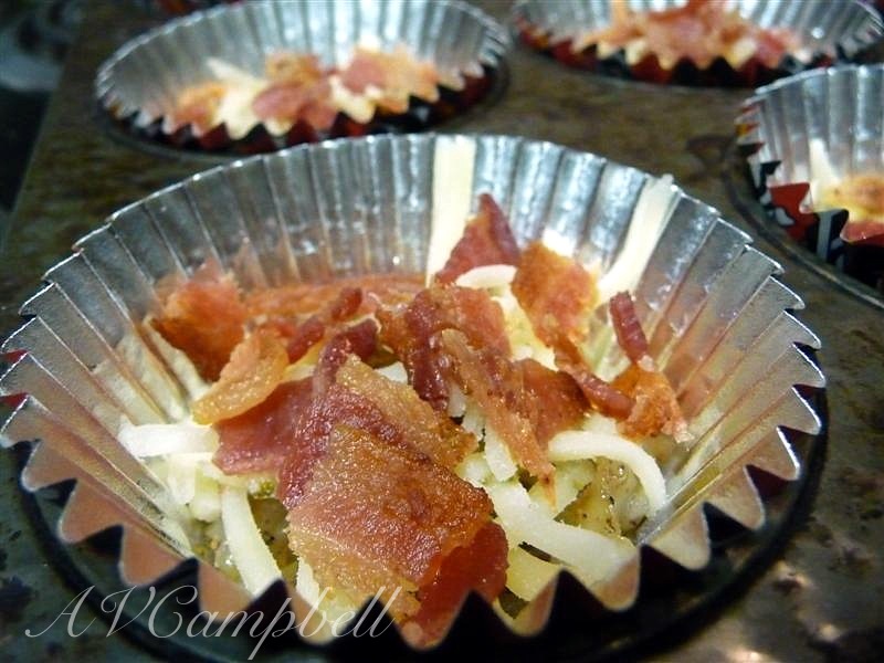 3. Fill bottom of each cupcake tin with potato shallot mixture, top with a generous pinch of cheese and chopped bacon. Pour egg over the top and bake until firm, about 12 minutes.
