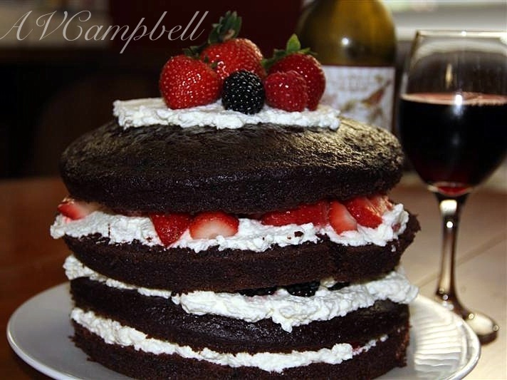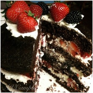It was a go! It was determined that the cake looked fine, no harm no foul, so I proceeded to assemble the cake. I cut each layer in half and filled the layers with freshly whipped whip cream, raspberries, blackberries and strawberries lightly dusted with sugar. Being a four layer cake, the slices were HUGE! So big in fact that I had to use dinner plates for serving. The cake was a hit! My mom, who isn’t much for chocolate cake to begin with enthusiastically said, “This recipe is a keeper! This cake is very good!” The cake was chocolatey, moist and spongy. All things I’ve been looking for in a made-from-scratch cake. Finally!! 🙂