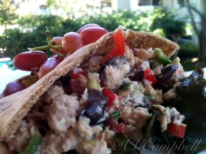 I present to you this weeks lunch selection, Mediterranean Tuna Salad in a whole wheat pita! I love tuna salad.. whether sandwiched between two slices of bread, tucked away in a pita, smeared on a cracker or scooped with a chip!  My mom makes the best tuna salad. I don’t know if it’s the ingredients she uses or the fact that someone else has prepared it.  But YUMM!!!!  The only thing I’d have her change, well two things actually, are: 1) go lighter on the mayo and 2) STOP calling it “tuna with gunkies”. Although delicious, no one wants to think of their food as having, “gunkies”. 😉 I don’t know if “gunkies” is even a recognized word…