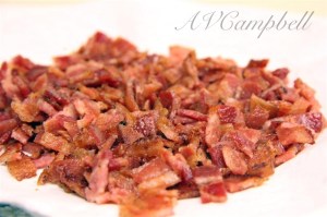 In a large skillet, over moderate-high heat, cook the bacon until brown and crispy, about 5 to 7 minutes. Drain well and place bacon on an absorbent paper. NOTE: when making this at home, I baked the bacon. I didn’t have the time to supervise the bacon while it snapped, crackled and popped in the skillet and I didn’t want to smell like bacon. To bake, place bacon on a foil and parchment paper-lined sheet pan. Some place the bacon on a rack atop a foil and parchment paper-lined sheet pan. Although it may be a bit overboard, the foil helps with clean-up! 🙂 Place sheet pan of bacon in a cold oven, turn oven on to 400 degrees F and bake for 20 minutes, give or take to reach your desired doneness. Cool and drain bacon on paper towels, then chop.