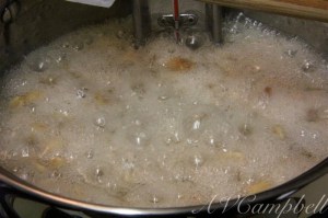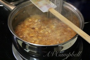 Once the candy is at the hard-crack stage, remove from the heat. Stir in the butter, vanilla, baking soda, and bacon.