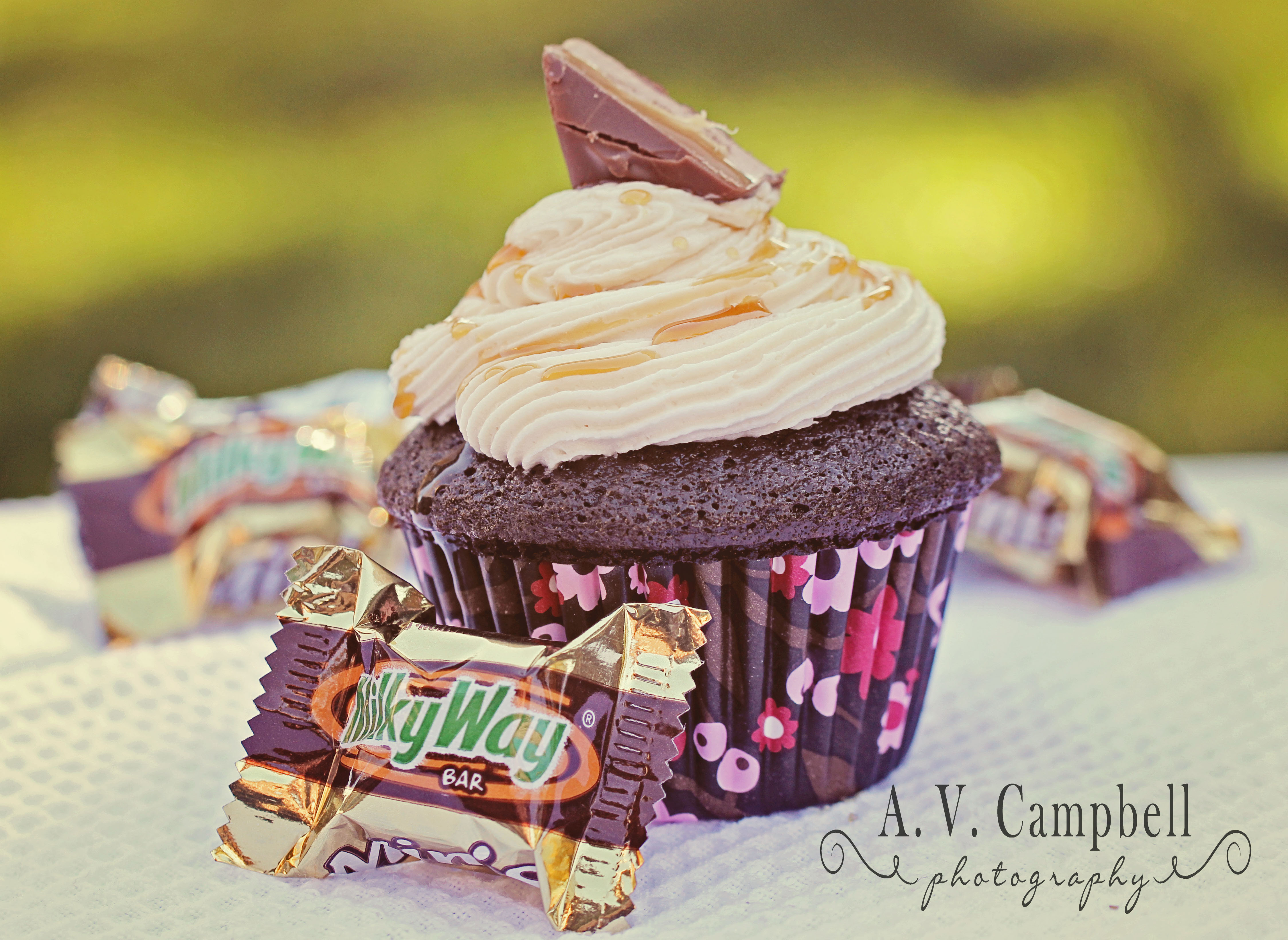 I decided early on that I’d make Milky Way Cupcakes  with Carmel Buttercream Frosting, Chocolate Cupcakes with Raspberry Buttercream and Lemon Cupcakes with Cream Cheese Frosting.  For the Milky Way Cupcakes and the Chocolate Cupcakes, I used my friend Sandra’s family recipe for Chocolate Cake and split the recipe in half between the two types. For the Caramel and Raspberry Frosting, I used my Caramel Buttercream recipe and split between two bowls before flavoring with caramel. For the Caramel Buttercream I added caramel to taste. For the Raspberry Buttercream, I used a combination of raspberry jelly (or was it jam? It was whichever one doesn’t have seeds! 🙂 ) and a tiny bit of raspberry flavoring to taste. Sounds like a piece of cake, right?